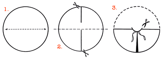 Cut a slit from the top point of the circle - halfway down to the center. Cut a shorter slit from the bottom. This way - the front half