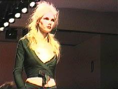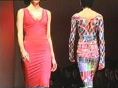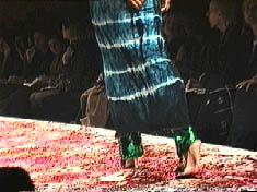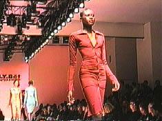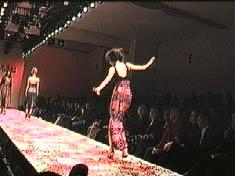 Known for revamping the low-end Parisian shopping mecca of Tati, Xüly Bet showed some beautiful stuff in his Chelsea Piers debut. Having first infiltrated New York through his Rue du Ludlow boutique on the lower eastside, Xüly Bet did a fierce ethnic twist, with much batik and tye-dye, all without revisiting Woodstock. The lack of music during the first part of the show prompted the French quarter of the photo pit to yell "bonjour" and "au revoir" with each passage, which in turn prompted giggles from all areas. Good times. One poor Asian model, who walked in heels like a drunken sailor on a tightrope, offered some much needed comic relief from the long week, en generale. (The shows were especially geographically trying to get to, requiring a complicated journey from camel to moat crossing vessel, while trying to get a cab.) Colors and textures were brilliant, and were a sight for eyes sore from the long playing "English Patient" khaki influence. The only drawback on the horizon maybe the return of the long-playing summer slip, albeit tie-dyed. |