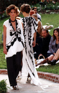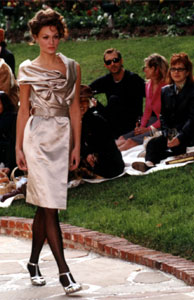 Speaking of glitz, the race to dress Oscar night was brutal as ever this round. In keeping with tradition, the majority of the American contingency was in competitive denial about actually pursuing this end. A snappily protective Ralph Lauren representative told us, "We don't send out racks of clothes like Calvin does", yet Hollywood somehow magically receives his gowns -- pre-season. Calling it like it is, Dame Vivienne Westwood, is very open about her Oscar ambition and staged a garden showing of her Gold Label collection, especially for Hollywood.