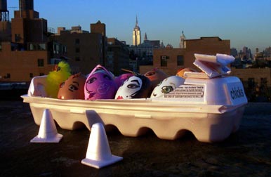 Permanent black Sharpies work wonders as eye-liner - (on them, not you) but make sure the eggs are totally dry first. Dyed ot not, cottonballs make great wigs. These chicks can go from goth to super sassy. Who cares what the neighbors think? Hold on to your carton for later transformation into the convertible limo of your dreams. Even though our driver looks suspect - we know he's a good egg!