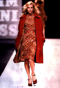 Men's suits, (the pimpier the better) are good for filling fall wardrobe voids. Best with a feminine edge (we're still girls) like vampy lipstick (either Chanel's namesake or Wet 'n' Wild #508 ). For the most in custom lip dressing, pick up a tube of solid black by Make Up Forever (# L86... Barneys, Pierre Michelle Salon) to blend with your useless, leftover reds ready for pasture. Added bonus: it doubles as smudgy black eye shadow. The gender blending scene is not even unusual anymore. Pushing further into everyday - way beyond Ru Paul's MAC gig - you know it's time to find a new trend when you're a short haired girl in a man's suit sitting next to Billy Beyond out of drag - and you're both on the same casting for something as mainstream as a West cigarettes campaign. The main vibe for fall is to mix all of it up. No, no, matchy, matchy. Mix crocheted tights and fishnets with unexpected colors, plaids, and fabric textures, and just when you think it's a bit too tacky to leave the house, you're probably on the right track. Walk tall, think and stand tall, wear longer (tall) silhouettes... long, long, long. Those platforms really help. Other fall key words are jersey & knits, leather & suedes, metallics & brights, aka lime green and orange. Lime green has stayed at the fair a bit too long, and gets tired in the make-up dept., but just about everybody looks good in some variation of orange. Style wise, things really haven't evolved much since this time last year. The big ring contender's are still Simple versus the long playing '70s Pimpadelic influence, with that "modern" area somewhere in-between. Much of the current modification of true '70s silhouettes come from the bitter facts that producing those interesting decorative top-stitching and multi pieced pattern structures is very expensive. Shapes that come from bias cut construction leave wasted chunks of fabric excess, and is not very budget efficient. Straighter A-lines are not only less expensive to produce, but lend a more modern vibe. Yet another clue unraveling the lengthy play of simplistic dressing. With more consumers fed up with the copycat system that's been giving American fashion a sour taste lately, companies that have proven to have longer staying power than Madonna are the ones to invest your bigger dollars in. The most original ideas immune to successful knock-offs seem to be coming from the Italian contingency. Watch for more Italian style invasion, as Little Italy jumps uptown to the Bendel's-Bergdorf's hood, with close to a dozen new boutiques due by next spring.